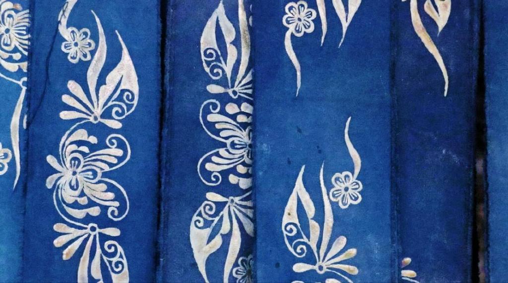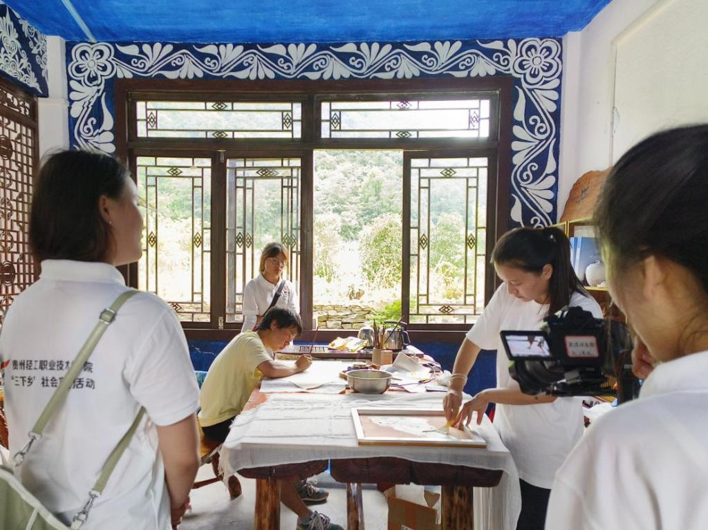 此次活动的第二站,团队来到龙井村染坊,走进布依族传统手工技艺——枫香染。据了解,枫香染是惠水布依族的传统手工技艺,距今已有两百多年的历史。它是将枫树脂与牛油等配料按一定的比例配制成枫香油,在绘画前,用高温把枫香油融化,再用毛笔蘸取适量的油在白布上作画;然后将画好的枫香画放到靛蓝染缸里面浸染一个星期左右,在此过程中需不断反复地提出来氧化,以起到固色的作用;最后用煮沸的开水将染好的枫香画进行脱脂,直至出现白色花纹,被誉为“画在面料上的青花瓷”,深受大众的喜爱。常用于被面、床单、衣服等生活用品的制作。于2008年被列入国家级非物质文化遗产。