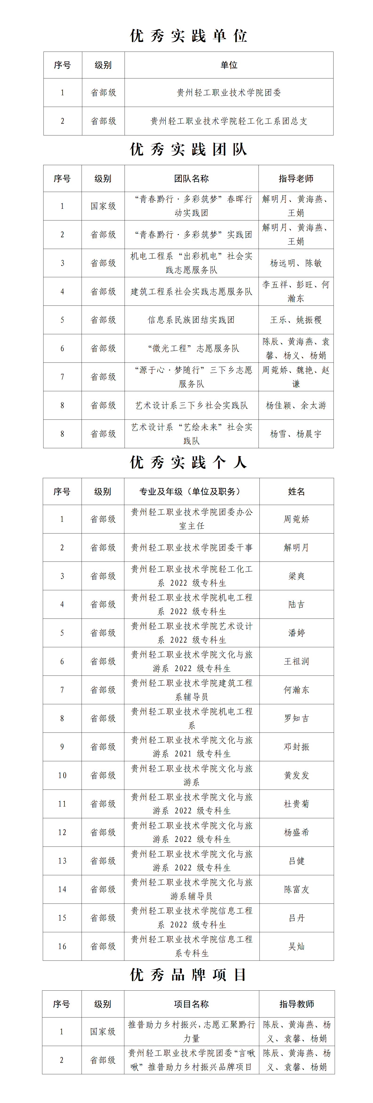 此外,由共青团中央、中共贵州省委宣传部、贵州省精神文明办、贵州省教育厅、共青团贵州省委、贵州省学生联合会联合举办的2023年贵州省大中专学生志愿者暑期文化科技卫生“三下乡”实践活动也对表现优异的单位、团队及个人进行了表彰。我院荣获贵州省“优秀单位”荣誉称号2个、“优秀实践团队”荣誉称号7个,16人被评为“优秀个人”,另有1个项目荣获“优秀品牌项目”荣誉称号。以下为详细名单: