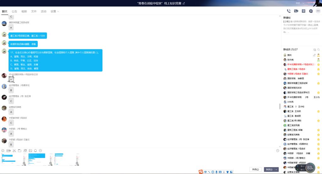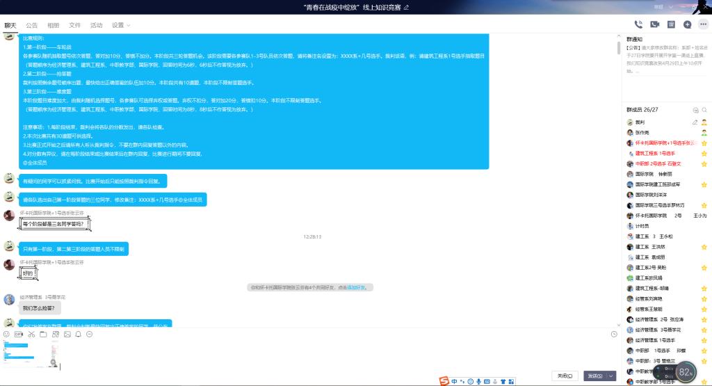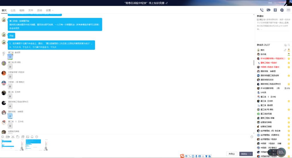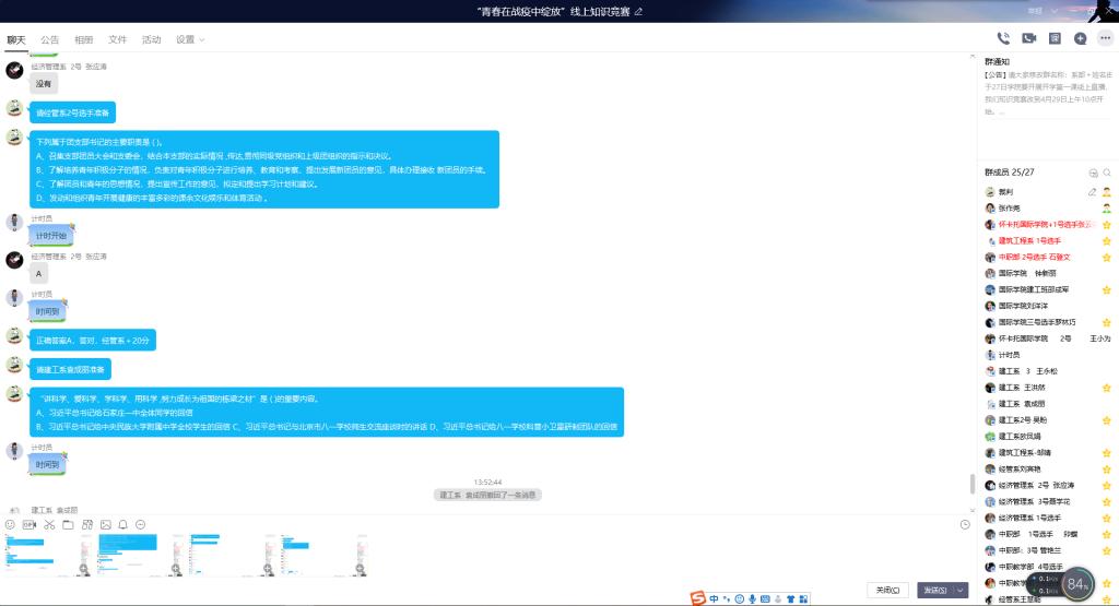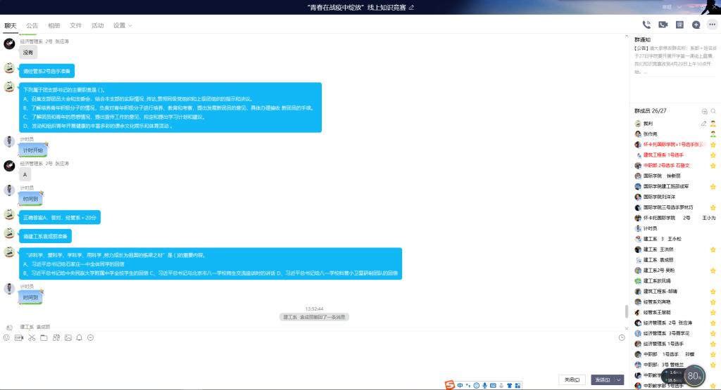 来自经济管理系、建筑工程系、怀卡托国际学院、中职教学部的四支队伍参赛。受疫情影响,本次比赛采取线上形式进行,比赛共三个阶段,分别是车轮战、抢答题、难度题。经过三轮激烈比拼,最后经济管理系以80分高分拔得头筹;建筑工程系以60分紧随其后,获得第二名;中职教学部获得第三名。