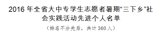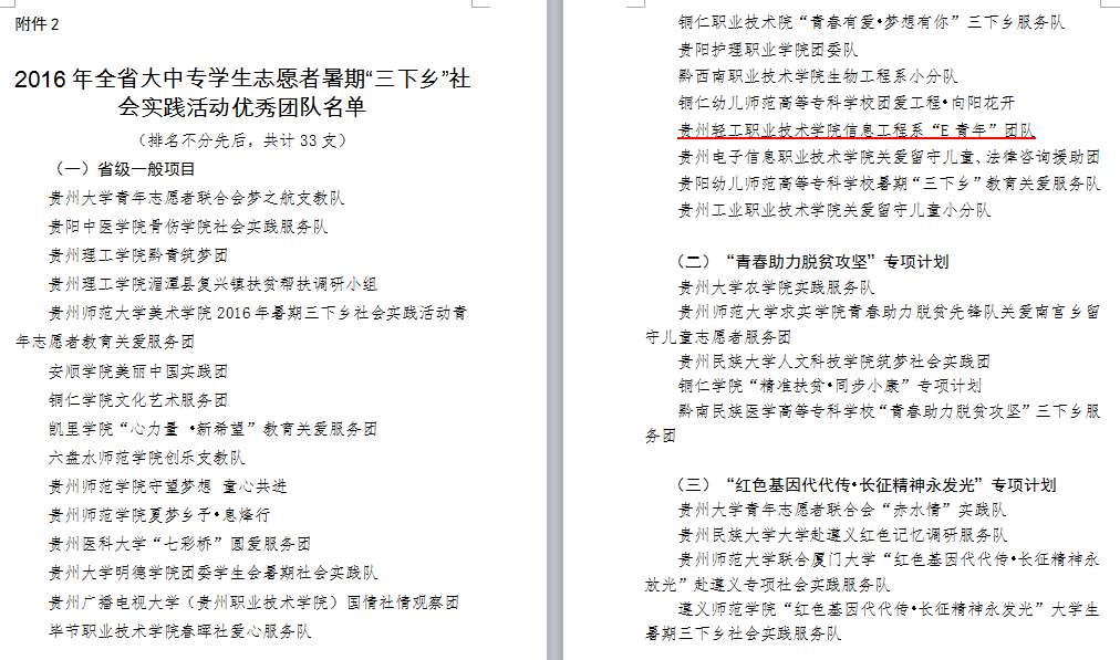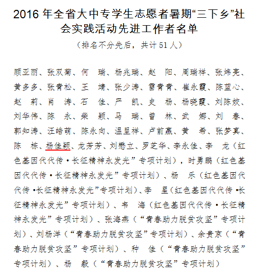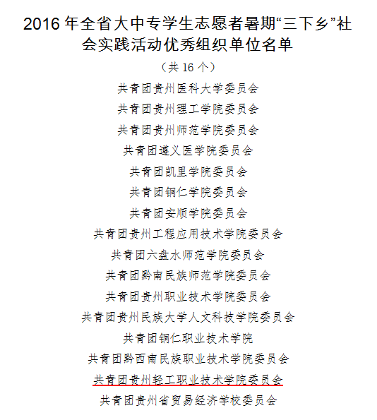 在省委宣传部、省文明办、省教育厅、团省委、省学联等部门联合组织开展的以“青春建功十三五·携手共筑中国梦”为主题的2016年全省大中专学生志愿者暑期“三下乡”社会实践活动中,我院团委共组织8支社会实践队伍,其中,信息工程系“E青年”团队获得“优秀团队”称号;周丹丹、孔宇轩、张宝龙、浦娟、袁勇、苟旭高等六名同学获得“先进个人”称号。艺术设计系社会实践队伍指导老师杨佳颖获得“先进工作者”称号,同时我院在此次三下乡社会实践活动中荣获“优秀组织单位”称号。
