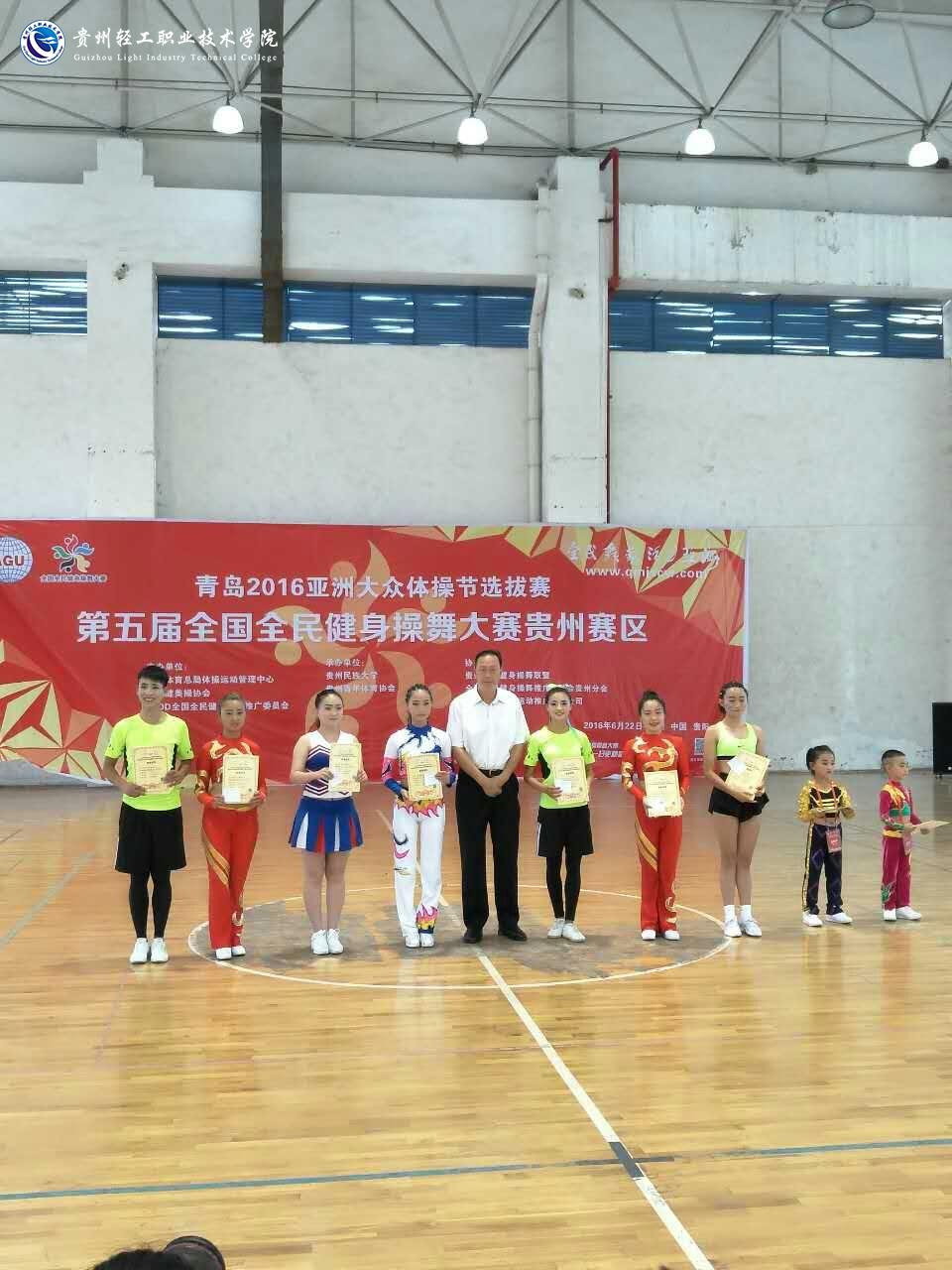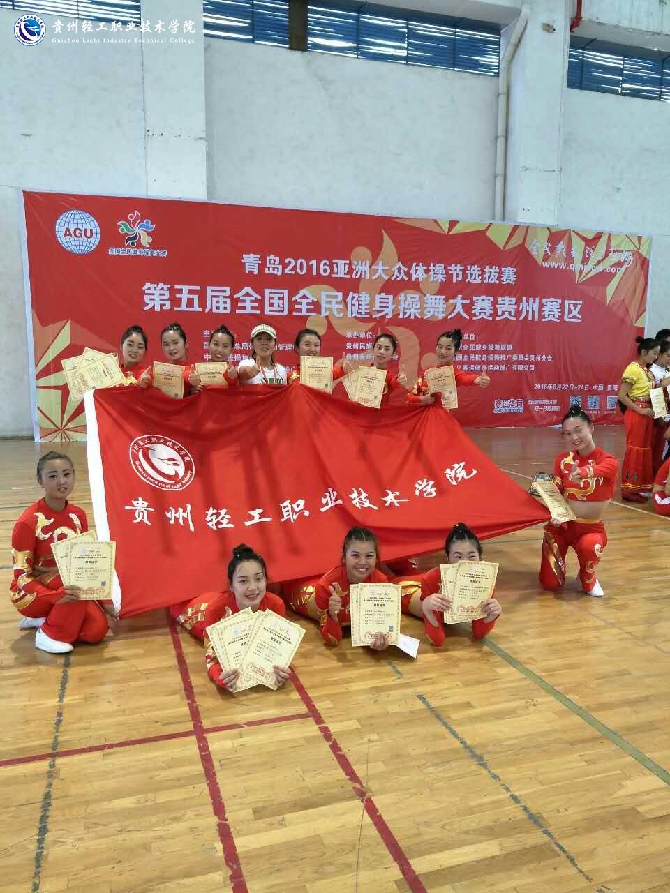 6月23日,青岛2016亚洲大众体操节选拔赛暨第五届全国全民健身操舞大赛贵州赛区比赛在贵州民族大学举行。我院健美操队在大众健美操二级、三级,有氧健身舞三个项目中获得一等奖。