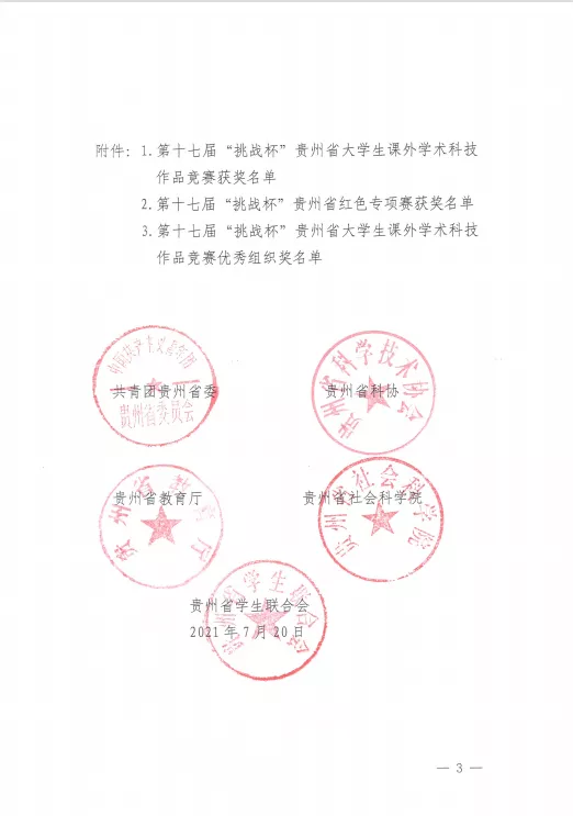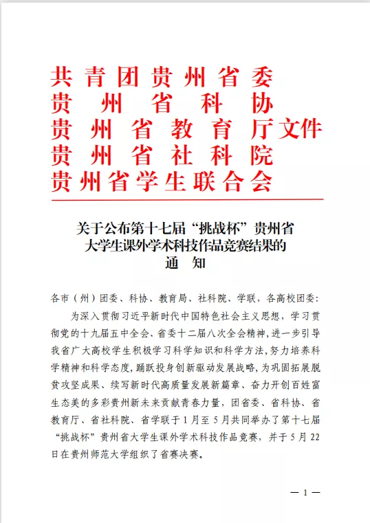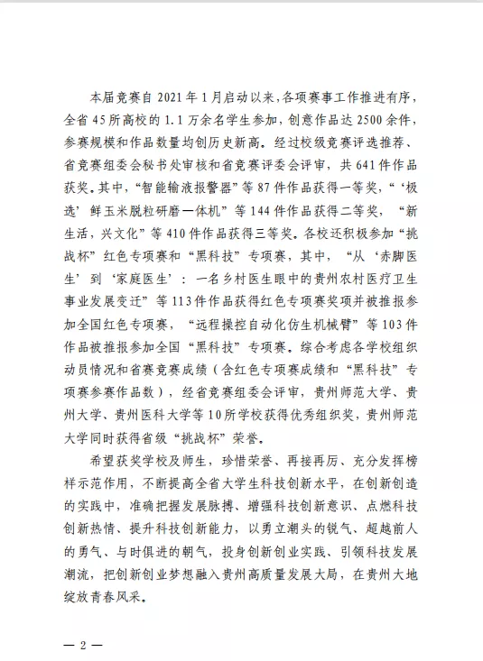 为深入贯彻习近平新时代中国特色社会主义思想,学习贯彻党的十九届五中全会、省委十二届八次全会精神,进一步引导我省广大高校学生积极学习科学知识和科学方法,努力培养科学精神和科学态度,踊跃投身创新驱动发展战略,为巩固拓展脱贫攻坚成果、续写新时代高质量发展新篇章、奋力开创百姓富生态美的多彩贵州新未来贡献青春力量,团省委、省科协、省教育厅、省社科院、省学联于1月至5月共同举办了第十七届 “挑战杯”贵州省大学生课外学术科技作品竞赛,并于5月22日在贵州师范大学组织了省赛决赛。