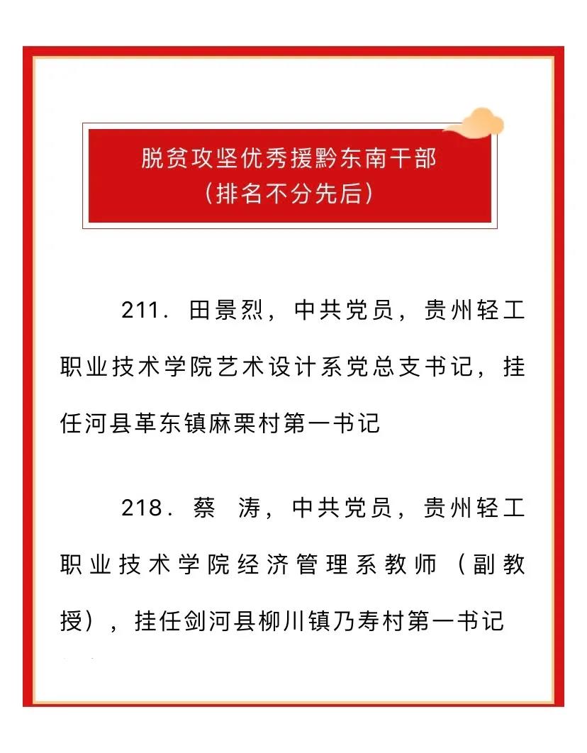 自2019年7月我院派驻剑河县柳川镇柳堡村干部蒲朝新荣获“黔东南州2019年脱贫攻坚优秀共产党员”、“优秀援黔东南干部”表彰,今年10月12日我院派驻台江县中等职业学校教育组团帮扶台江县中等职业学校副校长杨文通(挂职)同志荣获“黔东南州第一批支教名校长 ”命名,到10月14日田景烈和蔡涛两名同志荣获“优秀援黔东南干部”表彰,我院派驻援黔东南州,奉献脱贫攻坚—线四位同志均获黔东南州表彰。