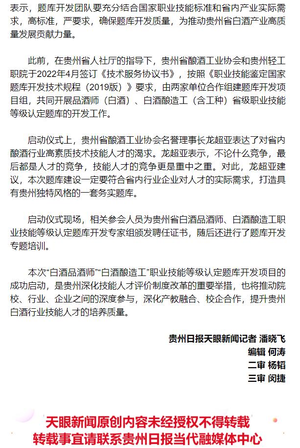 此前,在贵州省人社厅的指导下,贵州省酿酒工业协会和贵州轻工职院于2022年4月签订《技术服务协议书》,按照《职业技能鉴定国家题库开发技术规程(2019版)》要求,由两家单位合作组建题库开发项目组,共同开展品酒师(白酒)、白酒酿造工(含工种)省级职业技能等级认定题库的开发工作。