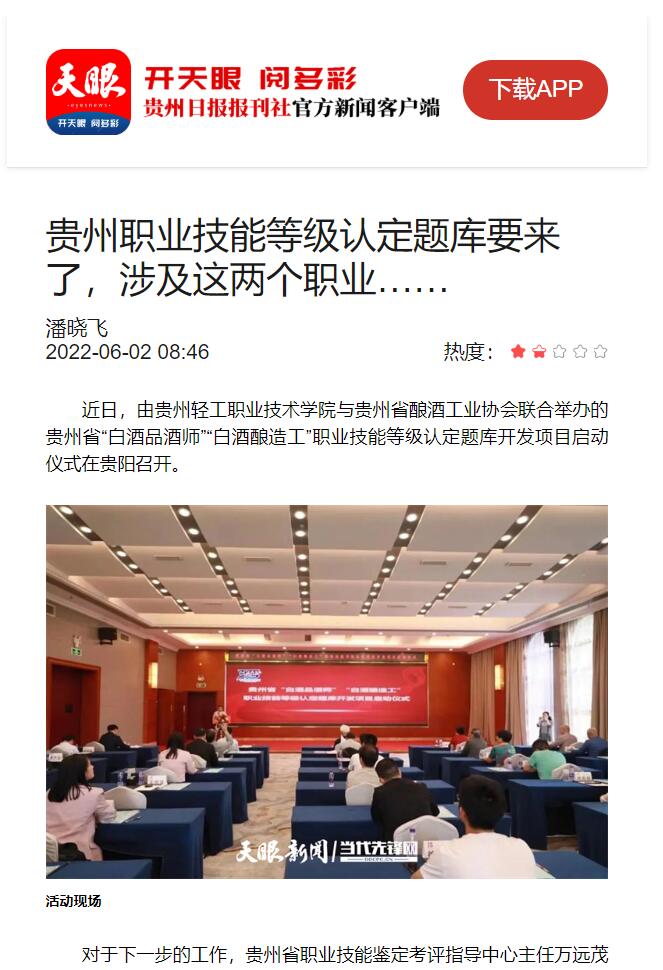 天眼新闻专题《贵州职业技能等级认定题库要来了,涉及这两个职业………》对学院与贵州省酿酒工业协会联合举办的贵州省“白酒品酒师”“白酒酿造工”职业技能等级认定题库开发项目进行报道。下面为原文内容: