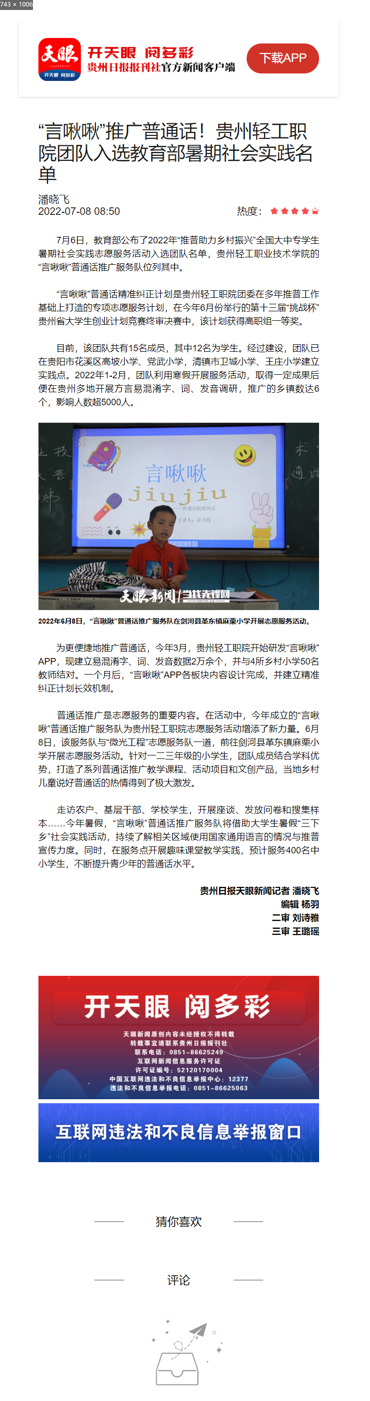 为更便捷地推广普通话,今年3月,贵州轻工职院开始研发“言啾啾”APP,现建立易混淆字、词、发音数据2万余个,并与4所乡村小学50名教师结对。一个月后,“言啾啾”APP各板块内容设计完成,并建立精准纠正计划长效机制。