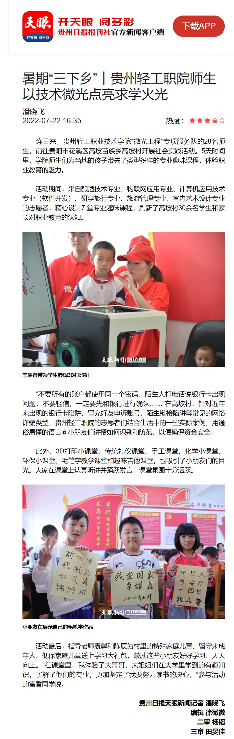 下面为原文内容:连日来,bwin必赢“微光工程”专项服务队的28名师生,前往贵阳市花溪区高坡苗族乡高坡村开展社会实践活动。5天时间里,学院师生们为当地的孩子带去了类型多样的专业趣味课程,体验职业教育的魅力。