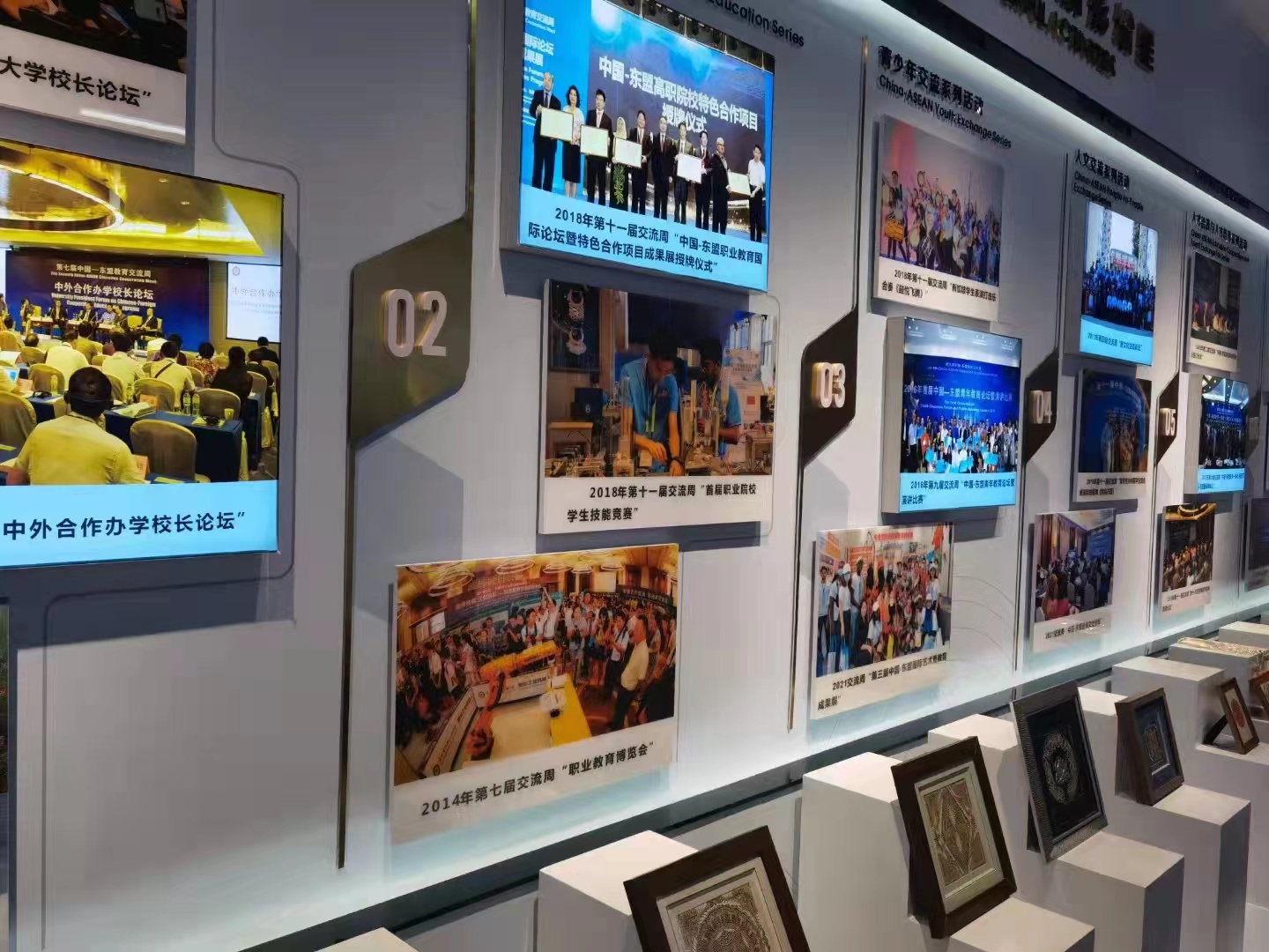 在“交流合作之美—中国-东盟教育交流周十五年展示馆”,讲解员对15年来东盟教育交流周为各国在对话交流、凝聚共识、促进文明互学互鉴、共同发展乃至推动构建人类命运共同体等方面所做的贡献进行一一介绍。