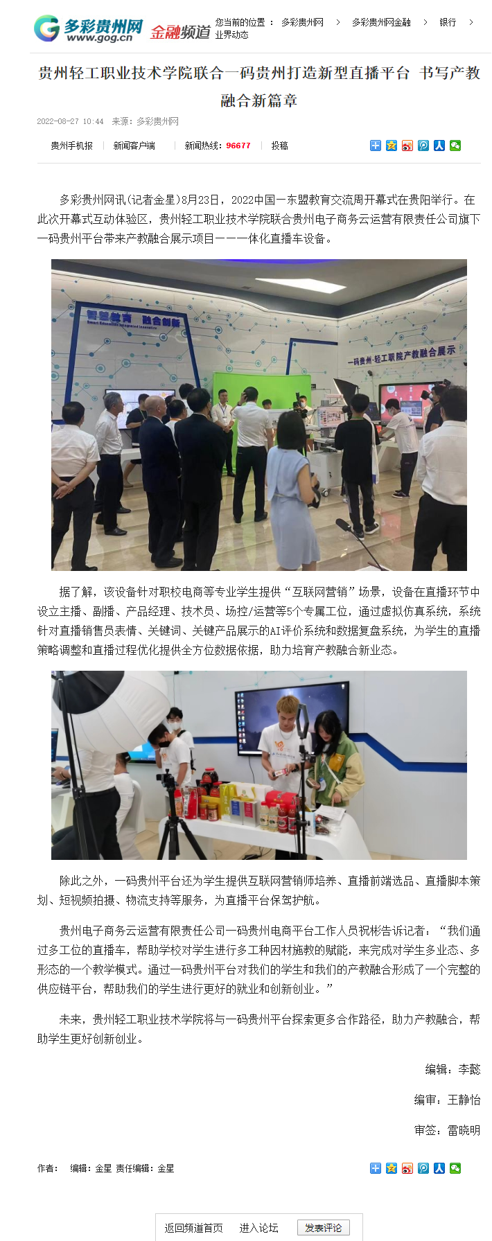 贵州电子商务云运营有限责任公司一码贵州电商平台工作人员祝彬告诉记者:“我们通过多工位的直播车,帮助学校对学生进行多工种因材施教的赋能,来完成对学生多业态、多形态的一个教学模式。通过一码贵州平台对我们的学生和我们的产教融合形成了一个完整的供应链平台,帮助我们的学生进行更好的就业和创新创业。”