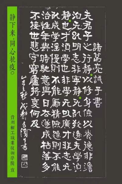该校民盟支部谢春涛、陈霁等民主党派人士积极发挥专业特长,精心制作抗“疫”海报鼓舞人心。谢春涛将古画作品中关于“静”的主题精心筛选,号召大家“静下心来齐抗疫”,创作海报二十余幅。陈霁以“宅”为主题,号召大家紧要关头,主动担负起“宅”的社会责任,全力配合疫情防控工作。