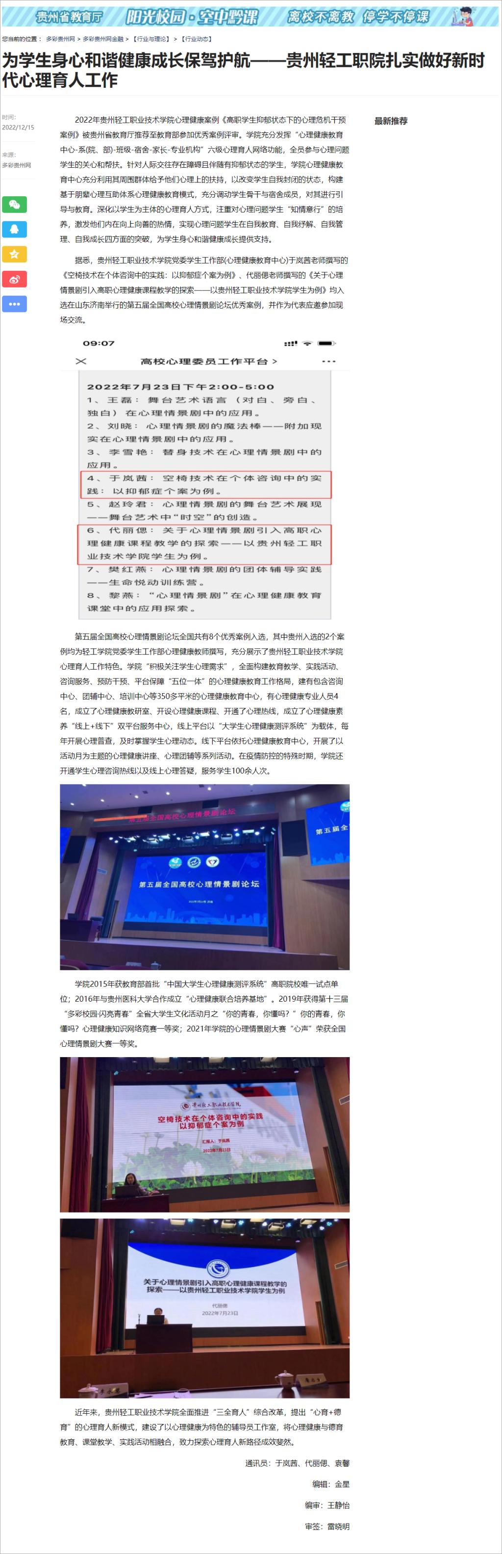第五届全国高校心理情景剧论坛全国共有8个优秀案例入选,其中贵州入选的2个案例均为轻工bwin必赢党委学生工作部心理健康教师撰写,充分展示了bwin必赢心理育人工作特色。学院“积极关注学生心理需求”,全面构建教育教学、实践活动、咨询服务、预防干预、平台保障“五位一体”的心理健康教育工作格局,建有包含咨询中心、团辅中心、培训中心等350多平米的心理健康教育中心,有心理健康专业人员4名,成立了心理健康教研室、开设心理健康课程、开通了心理热线,成立了心理健康素养“线上+线下”双平台服务中心,线上平台以“大学生心理健康测评系统”为载体,每年开展心理普查,及时掌握学生心理动态。线下平台依托心理健康教育中心,开展了以活动月为主题的心理健康讲座、心理团辅等系列活动。在疫情防控的特殊时期,学院还开通学生心理咨询热线以及线上心理答疑,服务学生100余人次。