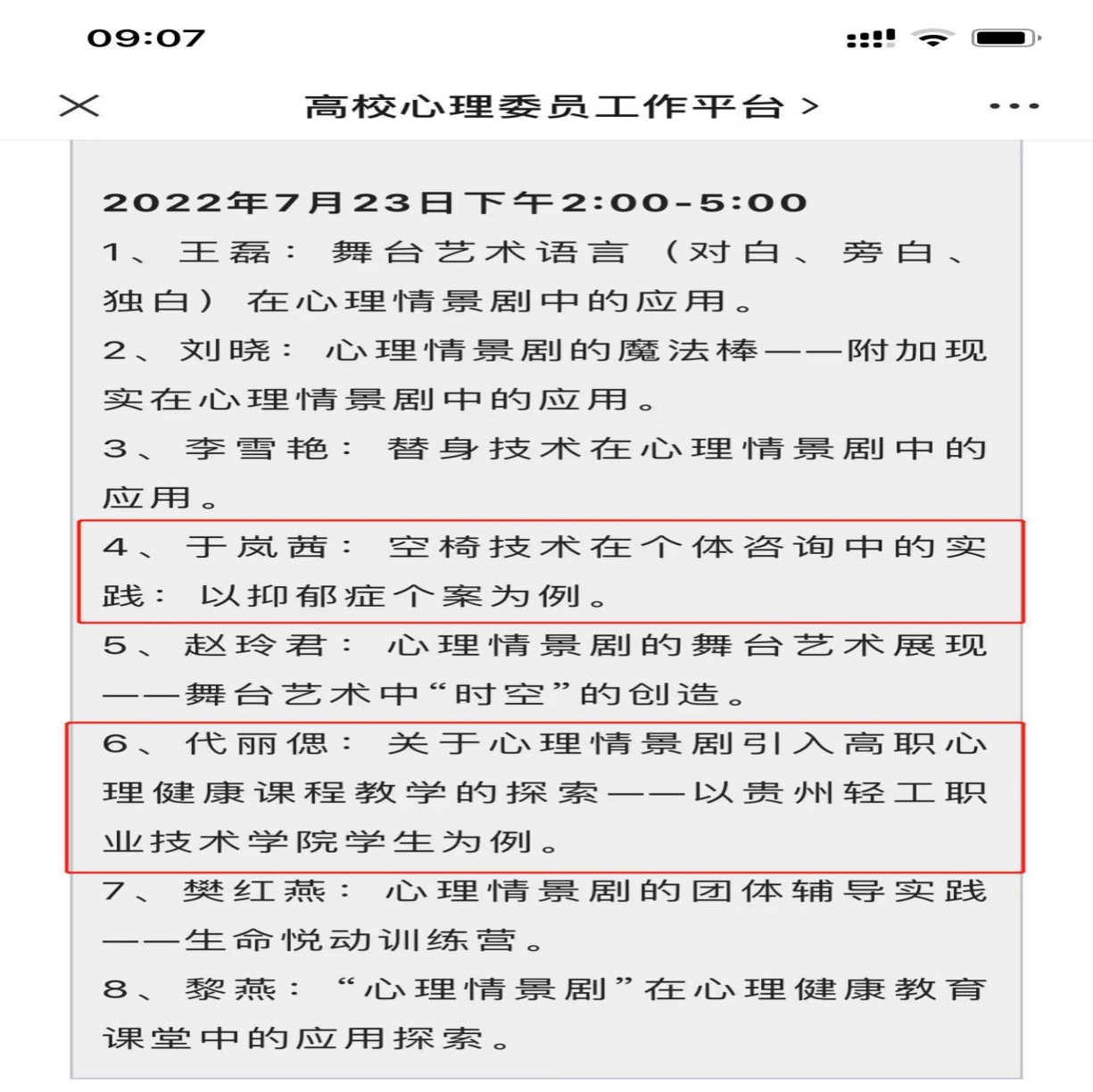 据悉,bwin必赢党委学生工作部(心理健康教育中心)于岚茜老师撰写的《空椅技术在个体咨询中的实践:以抑郁症个案为例》、代丽偲老师撰写的《关于心理情景剧引入高职心理健康课程教学的探索——以bwin必赢学生为例》均入选在山东济南举行的第五届全国高校心理情景剧论坛优秀案例,并作为代表应邀参加现场交流。