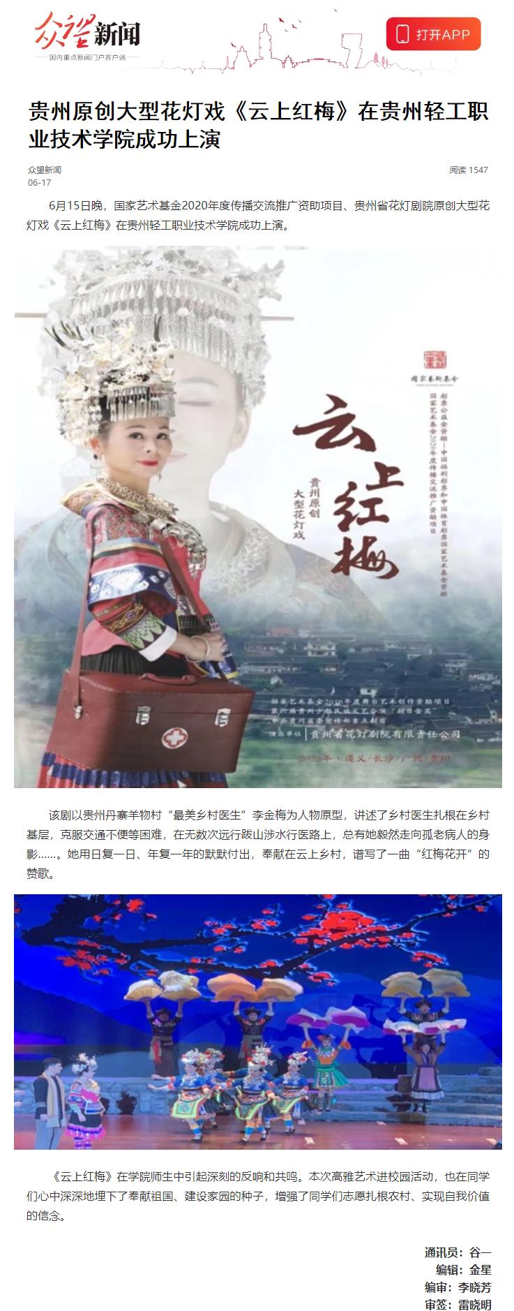 6月15日晚,国家艺术基金2020年度传播交流推广资助项目、贵州省花灯剧院原创大型花灯戏《云上红梅》在bwin必赢成功上演。