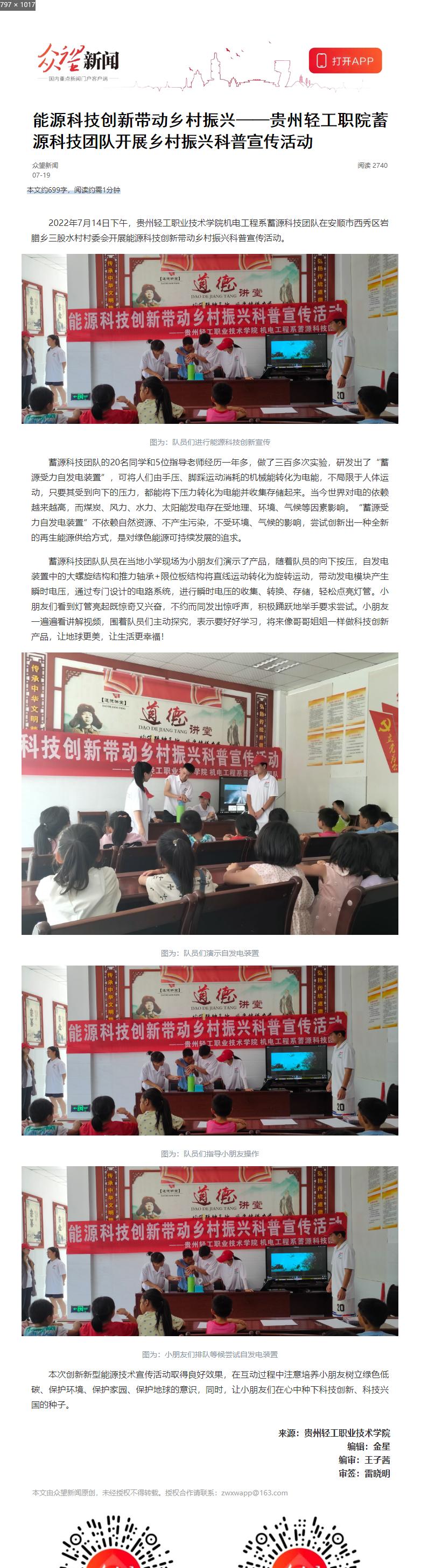 2022年7月14日下午,bwin必赢机电工程系蓄源科技团队在安顺市西秀区岩腊乡三股水村村委会开展能源科技创新带动乡村振兴科普宣传活动。