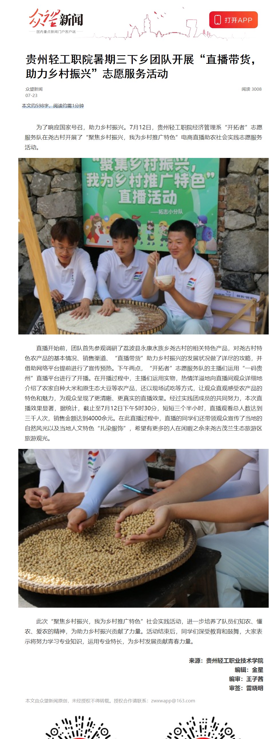 下面为原文内容:为了响应国家号召,助力乡村振兴。7月12日,贵州轻工职院经济管理系“开拓者”志愿服务队在尧古村开展了“聚焦乡村振兴,我为乡村推广特色”电商直播助农社会实践志愿服务活动。