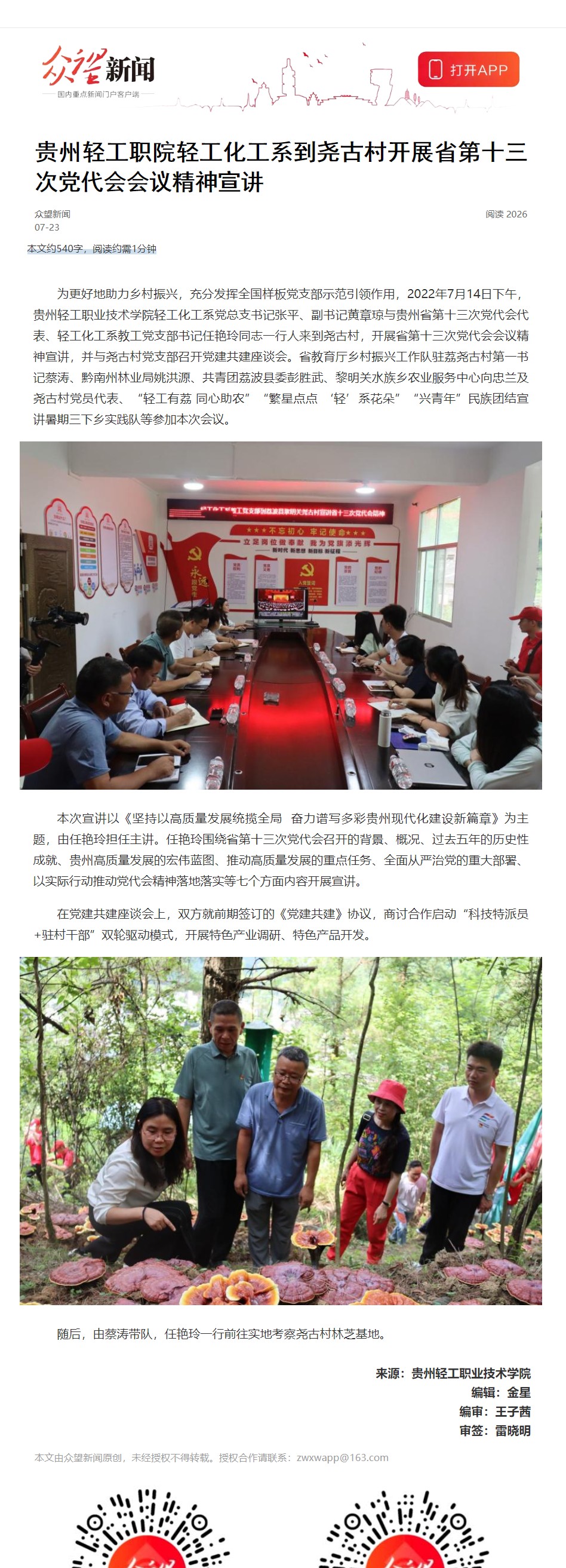 下面为原文内容:为更好地助力乡村振兴,充分发挥全国样板党支部示范引领作用,2022年7月14日下午,bwin必赢轻工化工系党总支书记张平、副书记黄章琼与贵州省第十三次党代会代表、轻工化工系教工党支部书记任艳玲同志一行人来到尧古村,开展省第十三次党代会会议精神宣讲,并与尧古村党支部召开党建共建座谈会。省教育厅乡村振兴工作队驻荔尧古村第一书记蔡涛、黔南州林业局姚洪源、共青团荔波县委彭胜武、黎明关水族乡农业服务中心向忠兰及尧古村党员代表、“轻工有荔 同心助农”“繁星点点 ‘轻’系花朵”“兴青年”民族团结宣讲暑期三下乡实践队等参加本次会议。