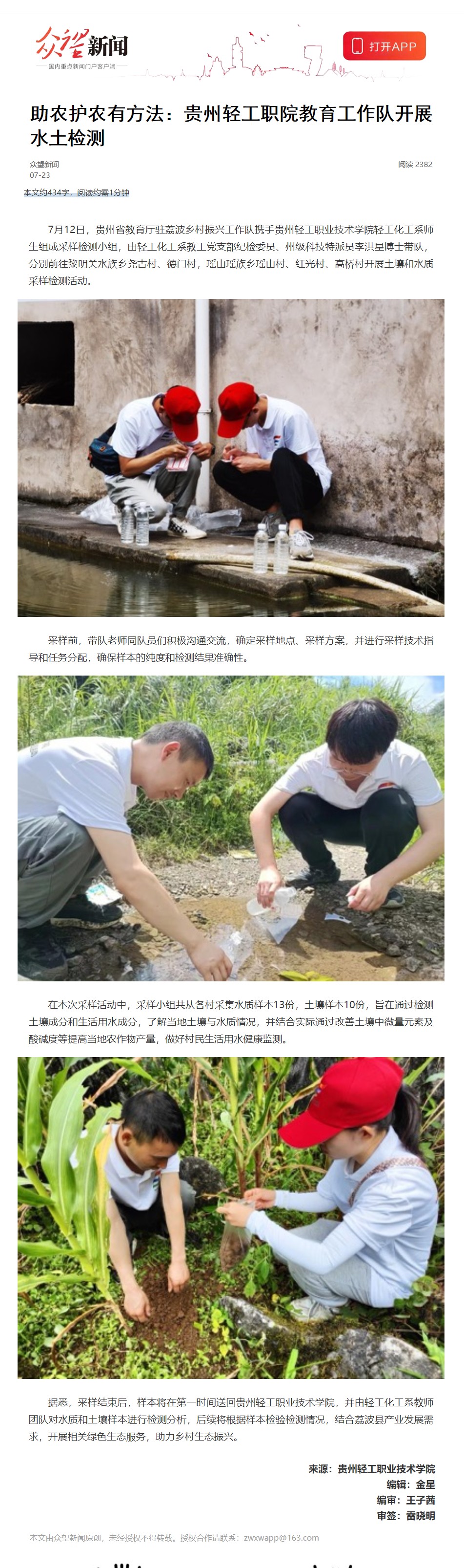 据悉,采样结束后,样本将在第一时间送回bwin必赢,并由轻工化工系教师团队对水质和土壤样本进行检测分析,后续将根据样本检验检测情况,结合荔波县产业发展需求,开展相关绿色生态服务,助力乡村生态振兴。