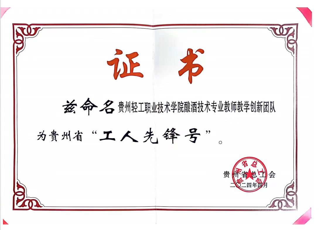 喜讯-bwin必赢酿酒技术专业教师教学创新团队获得贵州省“工人先锋号”